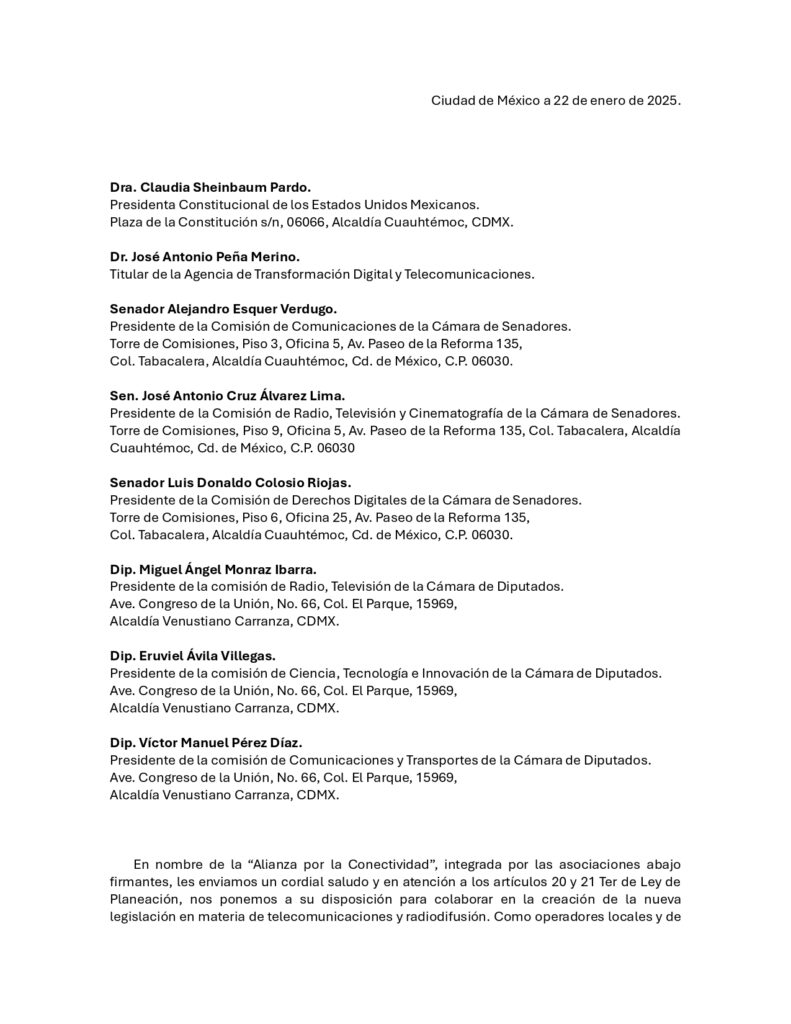 El 22 de enero de 2025, dirigimos nuestras recomendaciones a las principales autoridades del país, incluyendo a la Dra. Claudia Sheinbaum Pardo, Presidenta Constitucional de México, y a líderes del Congreso y las comisiones relacionadas con telecomunicaciones y tecnología.